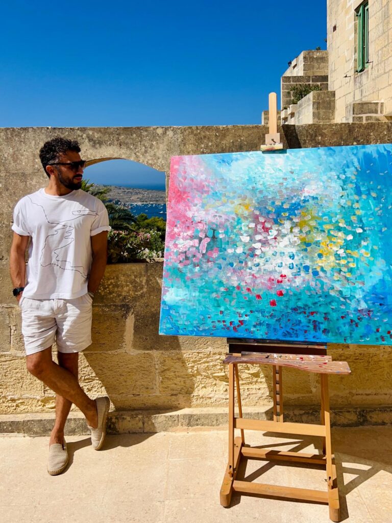 Rooted in both engineering precision and spiritual depth, Hessam creates where logic meets mysticism, where the human form becomes landscape, and color turns into invocation. Based between Malta and Germany, he paints under open skies and and stone arches, letting sea, sun, and solitude infuse his work. Each piece is a mirror of becoming: untamed, fragile, and fierce.